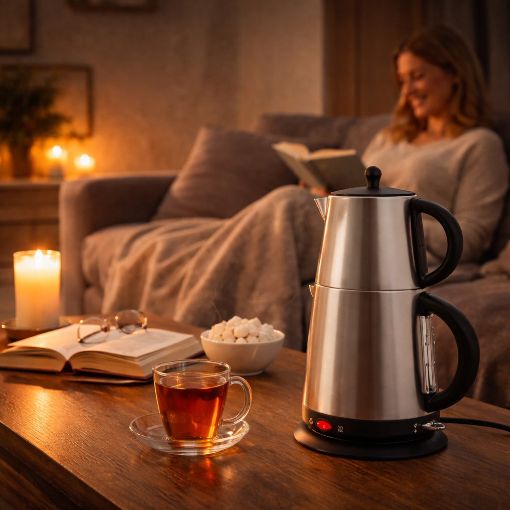 Ein ruhiger Moment, warmes Licht und frisch gebrühter Tee – so beginnt Entspannung im Alltag. Einfach einschalten und genießen.